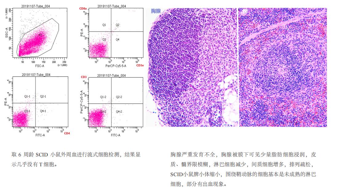 该品系表现出严重的联合免疫缺陷症状, B 细胞和 T 淋巴细胞功能缺失,有正常的 NK 细胞、巨噬细胞和粒细胞。